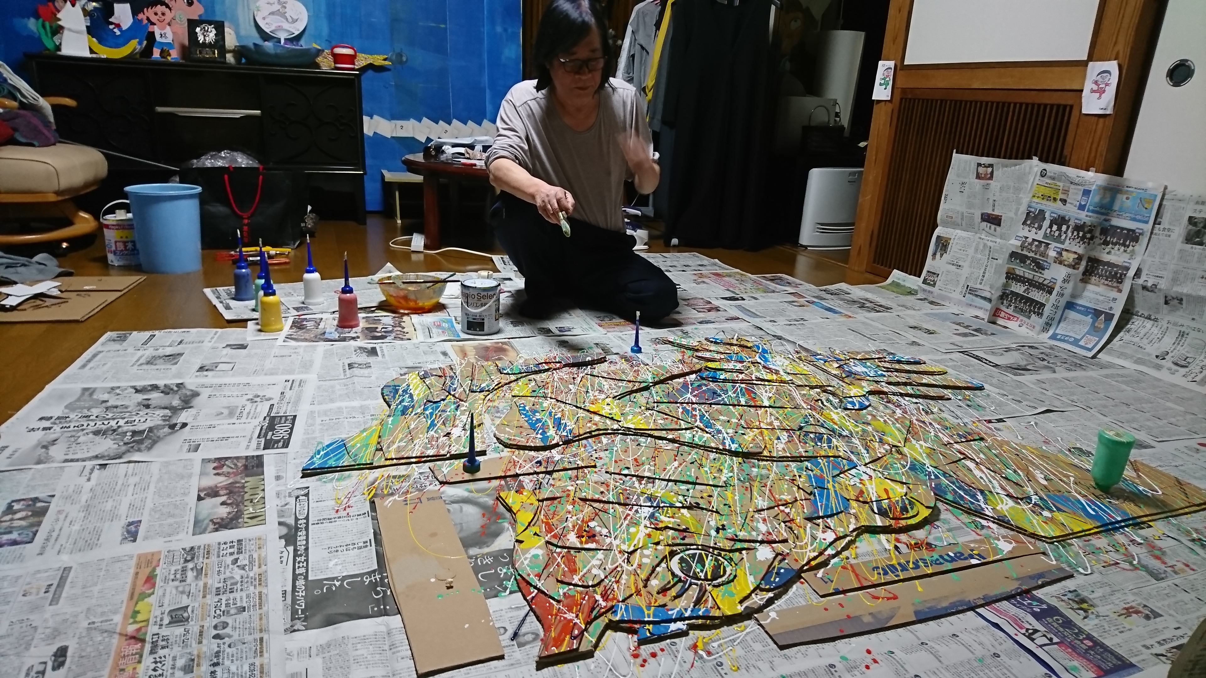| 段ボール、キャンバス、テープ、アクリル、オイル 91p×91p | 段ボール、コピー紙、ペン、アクリル 64p×47p | |