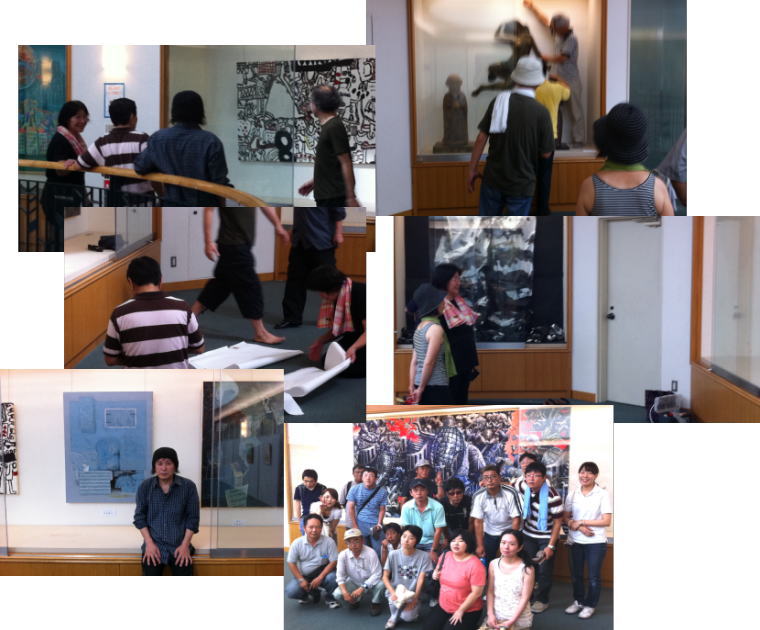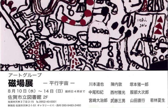 | 磁場展初日。二日酔いの川本さんとボクが平静をよそおい当番を勤める。常連さんが次々と見に来てくださる。 近年、磁場の入場者が増えているのはうれしいことです。 さて、メンバーの作品を簡単に紹介しましょう。 川本さんはS100号のアクリル画「現実と夢と」を2点。前回とはがらりと変わって、赤がグリーンに、ガラスの破片やビー玉がビル群に変貌している。 フレッシュで若々しい。作者の場所からのビル群が森や水を透して見えてくるのであろう。 題名よりはストレートに幽なる時空間が現出している。また、アクリル一本の川本さんだけに、アクリルが美しいのである。油彩でこうはいかないだろう。 陣内さんは21点・大小の作品を花壇の様に配置して「中庭」にした。 偶然に生じる抽象的な色や形態に基本的な興味や好奇心がある人だが、今回は淡く彩度が下げられ、植物の形態がフロッタージュされており、 化石の岩盤のようでもある。彩色にはクレヨンを使ったというが、ノウハウは不明(訊いてない)。 塚本さんはP150号・5点とM100号・3点の大作を出品。本格的な個展とも言える。ユーモラスな形や線になんとなく吸い込まれてしまうのも、 オリジナルな彼独自の下地や色があるからだろうし、余白と無骨な線が等価によりそいたのしく自由な世界を生んでいる。 題名も「心は叫ぶ」「月影たのしく」「嬉しい心」「僕の中に」「自分の存在」など。 中尾さんは例のひし形キャンバスに農夫婦を描いた。多分義父母であろう。このところ故郷や家族や友を捉えることで自分の位置を確認しているようでもある。 ひし形の農夫婦の周りには、カエル、サギ、イヌ、アカトンボが描かれた 三角キャンバス画配置され「農讃」となるのだろうが、それではすまないモノが裏にはある。 西村さんは毎回現場制作のインスタレーション。墨で着色した和紙を昆布状にして、ブースの中央から放射状にブースの外へと伸びる形状を創った。 「DON!」と鳴った花火を連想したのだが、クモや巨大蛸が触手を伸ばしたようでもあり、淫びに日ごろのうっぷんを晴らす作者自身であろう。 服部さんはベニヤ板5枚をつなげた4.5m×1.8mにアクリル。その上に磁場のメンバー11人の顔を張り付け「磁場の11人」とした。 やりたいことが多くて、毎回ころころ変わるようでもあるが、ただ、理屈なくドドーンと見えればそれでイイと、クリストの明快さを目ざしています。 武藤さんの「ナムナムナム」は、従来のモチーフとがらりと変わり、僧侶のようなお地蔵さんである。震災への祈りであると同時に自分の身体を通し、 仏への慈愛でもあるのだろう。 宮崎さんは今回控え目に1点。色彩と形による白い画面の「線」の時代が長かったのだが、「色彩と形による」線から面に移行した。 白い画面に深紅の赤がショッキングピンクにも。微妙な色の層の融合が醸す色と形の同時成立を同次元で可能とするのだろう。 山田さんは以前旅した「競輪幻想」。これまた従来の「葦とサギ」シリーズとはちがう。一見水墨画にも見えるが、アクリル画である。 アクリルで水墨画を狙ったとも見える、見方によっては不思議な絵であるが、大自然を前にした一人の人間の悠久桂林の賛歌であろう。 若林さんはF60号とパステル画の2点。若林さんは20代のころよりずっと同じモデルを繰り返し登場させ描かれている。 ランプ、楽譜、小舟、扉、ガラスの浮きなど透き通るように繊細に作者自身のように描かれている。心象風景であるである。幻想てきに外へ向かっていた 題名も前回の「漂流」?から今回は「Home of a homeless」と意味深よりも内部に向かっているところがちがう。 内と外をつなぐところに描くことがあるのだろう、いやつなぐために描くのかもわからない。そこのところは誰しも変わるまいが・・。 長くなりましたが、ひまつぶし、ひとりごととしてごかんべんの程を・・。 |