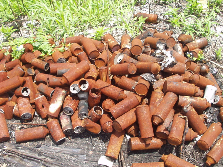 空は青く葦が茂り水鳥飛ぶ本庄江河口の危険物を焼却し放置された場所2004年/ 写真コピーと現場の焼け錆びた薬品缶